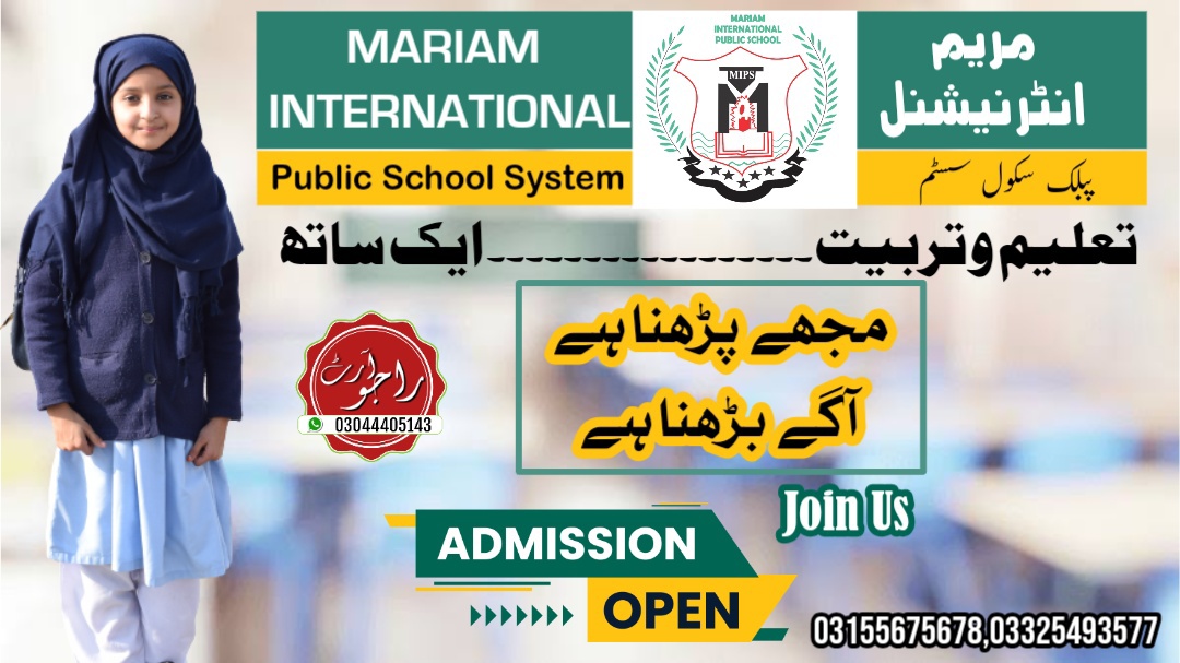 We are thrilled to announce that admissions are now open at Mariam International Public School! At Mariam International Public School, we pride ourselves on providing a nurturing and dynamic learning environment where students are encouraged to excel academically, creatively, and personally. Our dedicated team of educators is committed to fostering a love for learning while equipping students with the skills and knowledge they need to succeed in an ever-changing world. Mariam International Public School aims to cultivate well-rounded individuals who are prepared to make a positive impact on society. Join us on this exciting educational journey and unlock your full potential at Mariam International Public School. Apply now and embark on a path to a bright future!